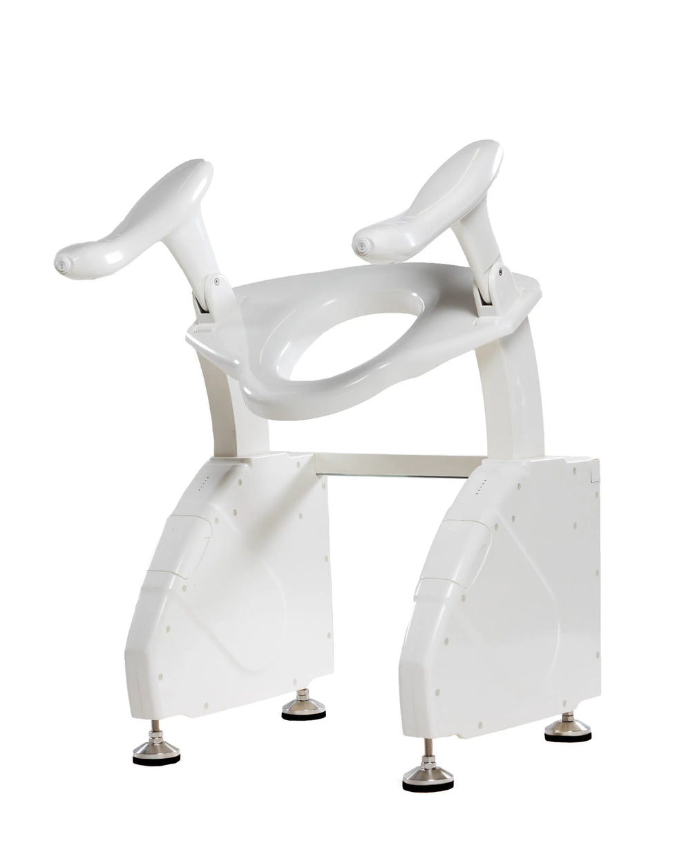 With an overall width of 24 7/8″, this lift is slim enough to fit into even the tightest toilet alcoves — just under the 25" minimum required by many building codes. The Dignity Lifts Deluxe Toilet Lift supports users up to 300 lb and offers 19 1/2″ of hip room (the distance between the side handles). To put that in familiar terms: 19 1/2″ is the same as the width of many office‐chair arms. If someone fits comfortably in an office chair, they will likely fit in this lift.